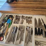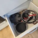 - ❓Is there a kitchen available at the apartment for guest use?Yes, the apartment is furnished with an equipped kitchenette and offers an electric kettle, a fridge, and a dishwasher as well.